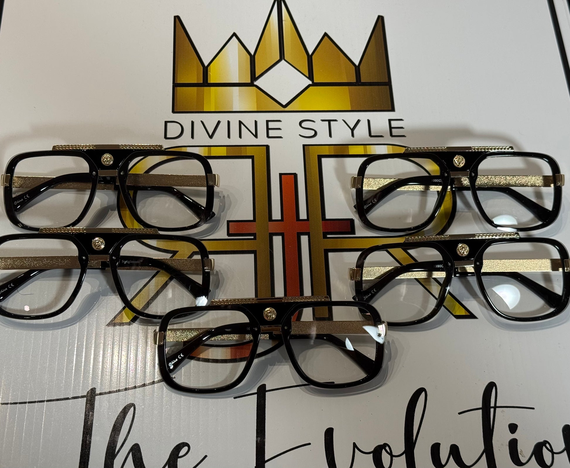 Black and Gold frames with clear lenses.