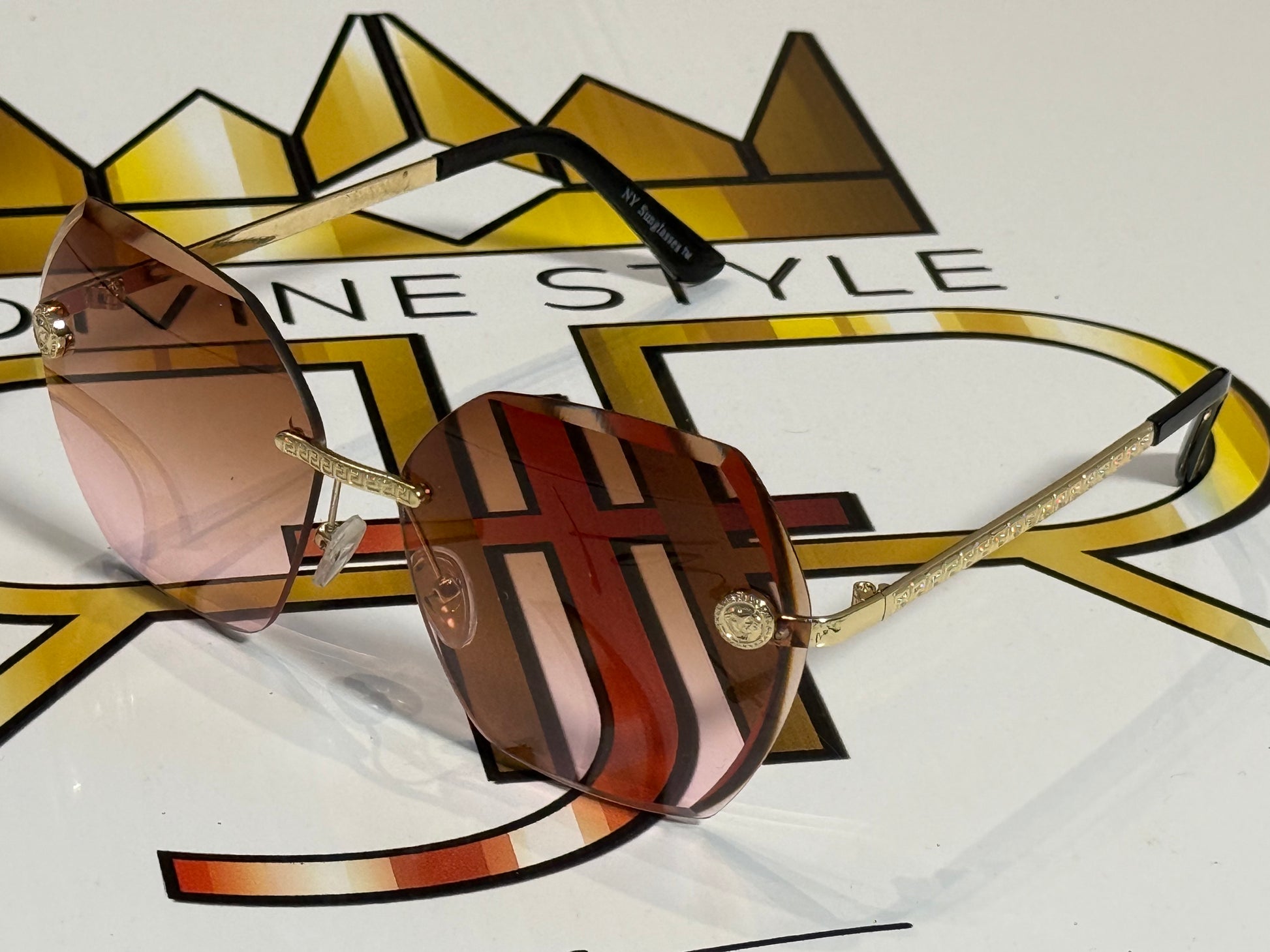 Pink and brown gradient with gold accents.